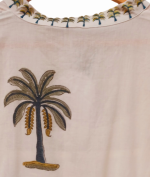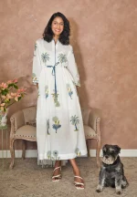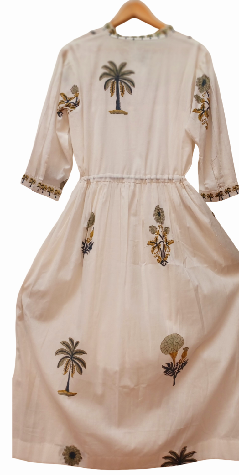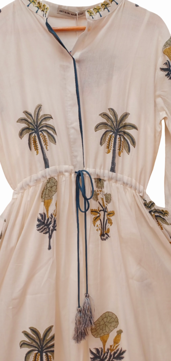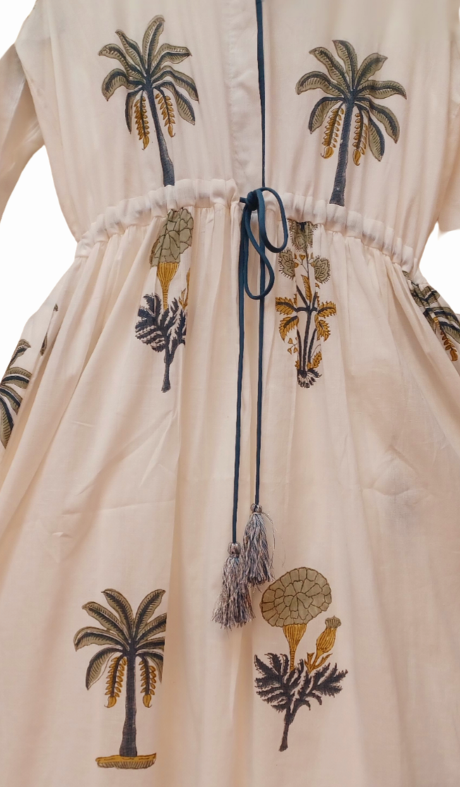 Crafted from pristine white Indian cotton, this beautifully hand-tailored piece showcases lush blue and green palm and floral motifs. Designed for effortless summer elegance, it features an adjustable drawstring waist for a flattering fit, an embroidered neckband and cuffs, hand-finished tassels, and contrasting piping along the placket.