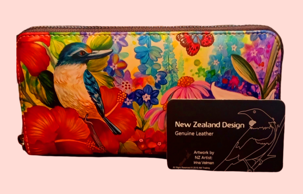Discover the epitome of elegance with our stunning leather purse, exquisitely showcasing artwork by renowned NZ artist Irina Velman. Bursting with vibrant colors, this unique piece celebrates the native wildlife and flowers of New Zealand, making it a standout accessory for any occasion. At ElenaPia Fashion, we take pride in curating items that blend art and craftsmanship, aligning with our commitment to natural fabrics and skincare. Elevate your style with this distinctive purse/wallet, a true testament to the beauty of nature and artistry.