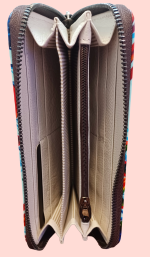 Features: Double sided, zip up coin purse, carry cards and notes.